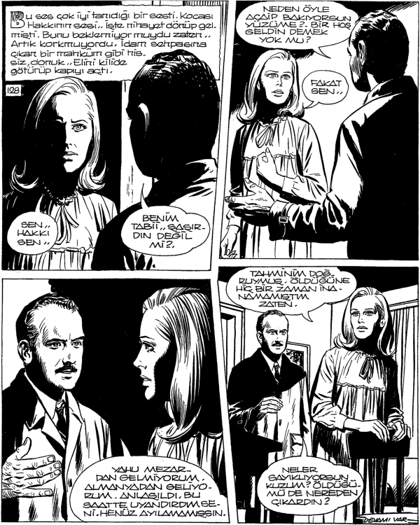This voice was a voice that she knew very well. It was her husband Hakkı’s voice. So he had finally returned. Hadn’t she been expecting this anyway? She was no longer afraid. She was like a criminal at the gallows, without feeling, frozen. (Lit., a criminal who had appeared at the gallows) She brought her hand to the lock and opened the door. |